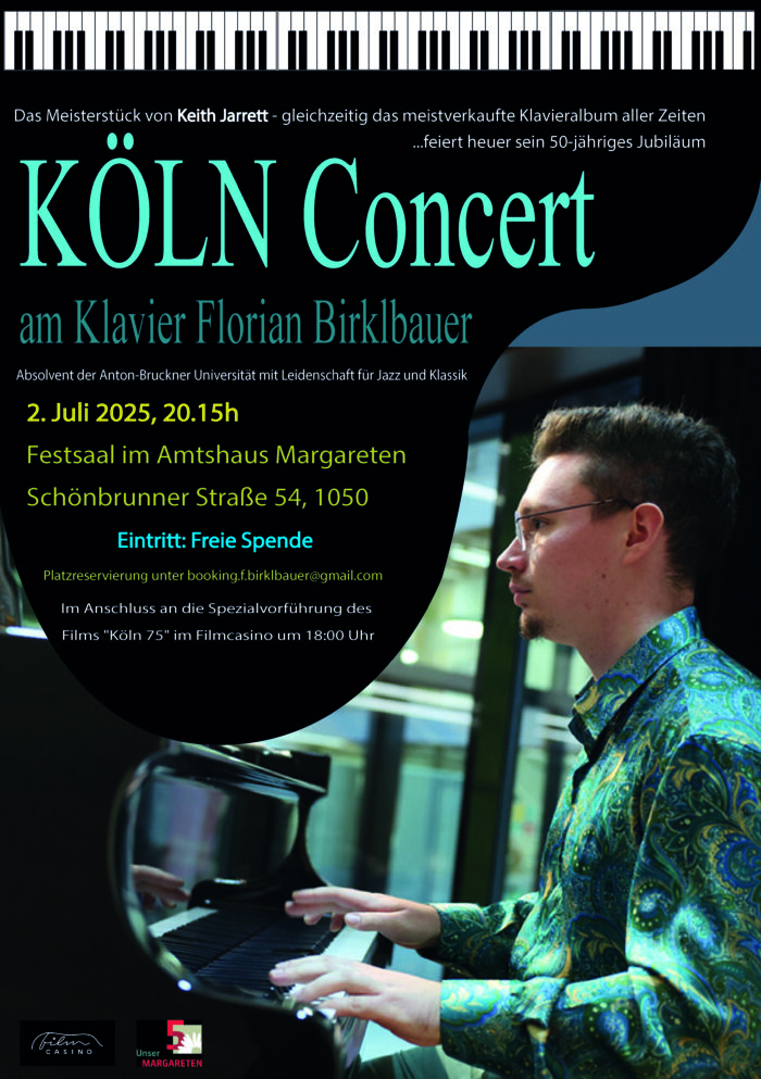 Man verlässt den Film gut gelaunt und mit dem dringenden Bedürfnis, das Köln Concert zu hören. Wir möchten daher unserem Publikum am 2.Juli ein ganz besonderes Double Feature bieten: Im Anschluss an den Film KÖLN 75 im Filmcasino gibt es die einmalige Möglichkeit, das Köln Concert live zu erleben! Nur wenige Gehminuten vom Filmcasino entfernt wird es der junge Pianist Florian Birklbauer, einer der wenigen Künstler, die sich dieses Werk erarbeitet haben, spielen. Karten für das Konzert gibt es direkt im Abschluss an den Film vor Ort im Festsaal in der Bezirksvorstehung. Das Konzert startet um 20:15 Uhr.