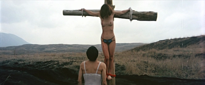 Radikal, reduziert, pointiert: die beiden Protagonisten (Toshiyuki Tanigawa und Eri Ashikawa) werden von einer Gruppe sadistischer Yakuza und ihren kreischenden Gespielinnen entführt. Man gelangt über holprige Wege in eine Einöde, wo die Frau nach einigen Misshandlungen an ein großes Holzkreuz gefesselt wird. Der Mann wird auf verschiedene Arten misshandelt, bevor er von den Peinigern zum Verkehr mit den Sadistinnen gezwungen wird. In seiner Wut und Hilflosigkeit beginnt er, sich aufzulehnen und erwürgt eines der Mädchen. Die Gräueltaten werden von einer Anhöhe aus vom Yakuza-Boss beobachtet, der seine Freude daran hat, das Liebespaar zu quälen, handelt es sich doch um seinen ihm untreu gewordenen Untergebenen. – Metaphorisch und grandios improvisiert, gedreht an den Ausläufen des Fujiyama. Drehbuchautor Yamatoya schrieb zwei Jahre zuvor Seijun Suzuki’s Branded to Kill / Koroshi no rakuin.